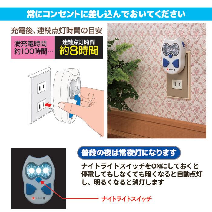 また、ナイトライトスイッチをONにし、コンセントに差し込んでおくと周囲が暗くなったのを感知して自動で点灯し足元ライトとして活用いただけます。