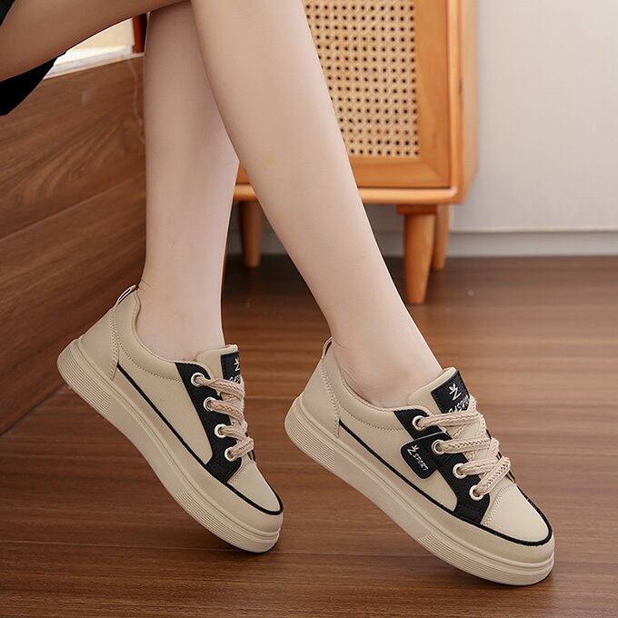 *黒*レディース レトロ感 バイカラー 配色 スリム スニーカー 紐靴 シューズ レザー調