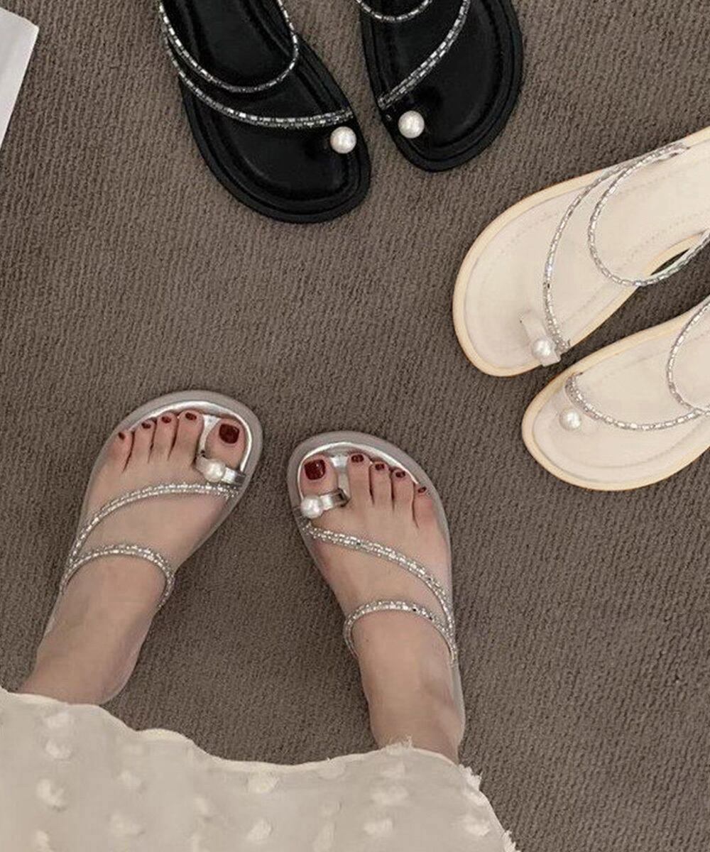 きらきら輝くビジューで飾られた細いストラップが、ヌーディーですっきりとした足元を演出する親指トングサンダル