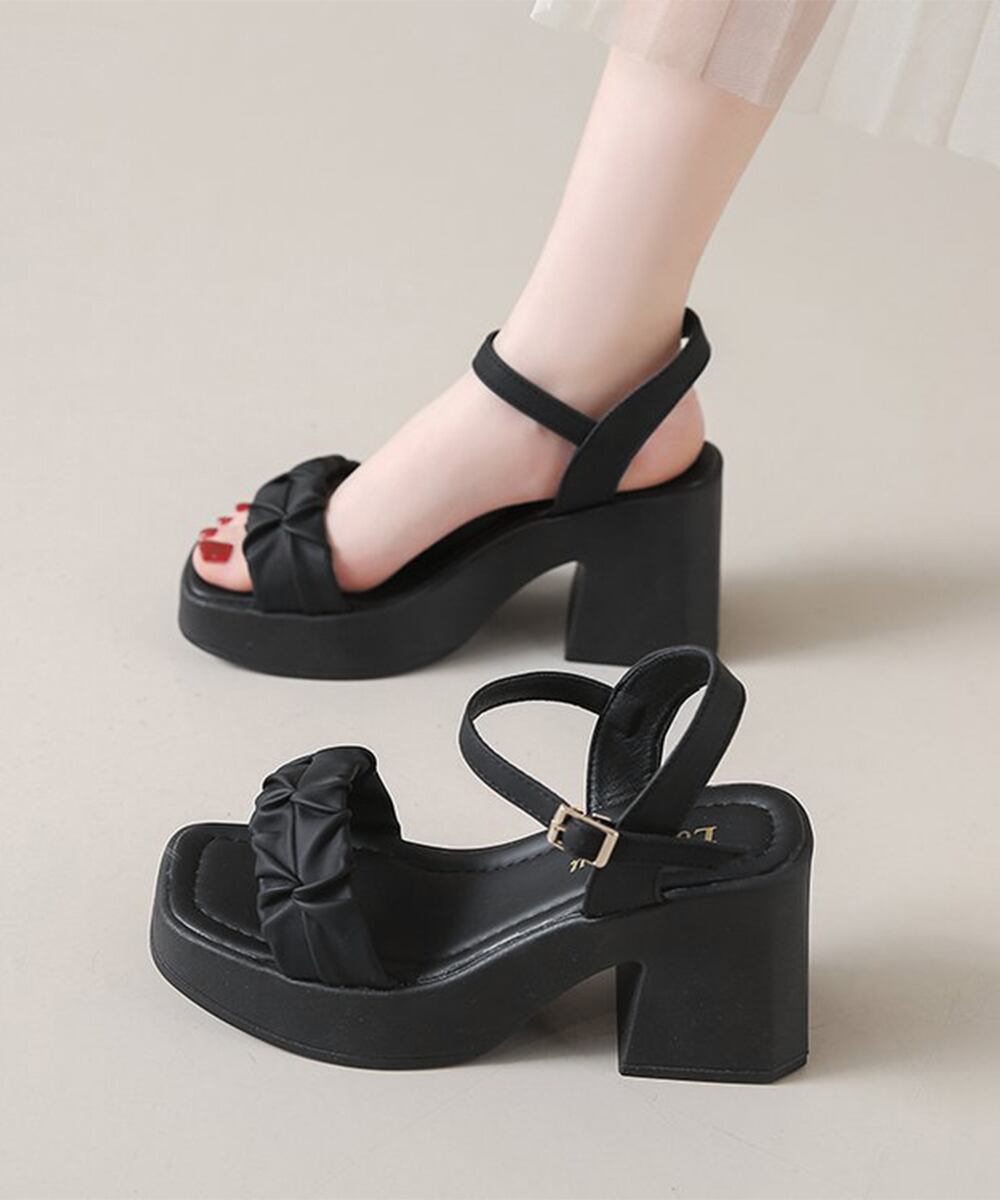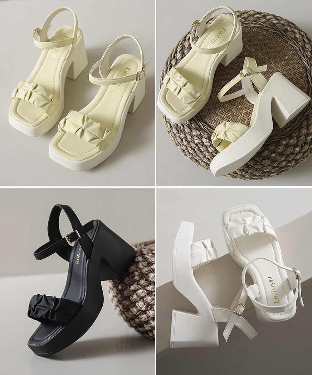 アッパーにはPUレザー素材を使用しており、ギャザーデザインがポイントのチャンキーヒールサンダル