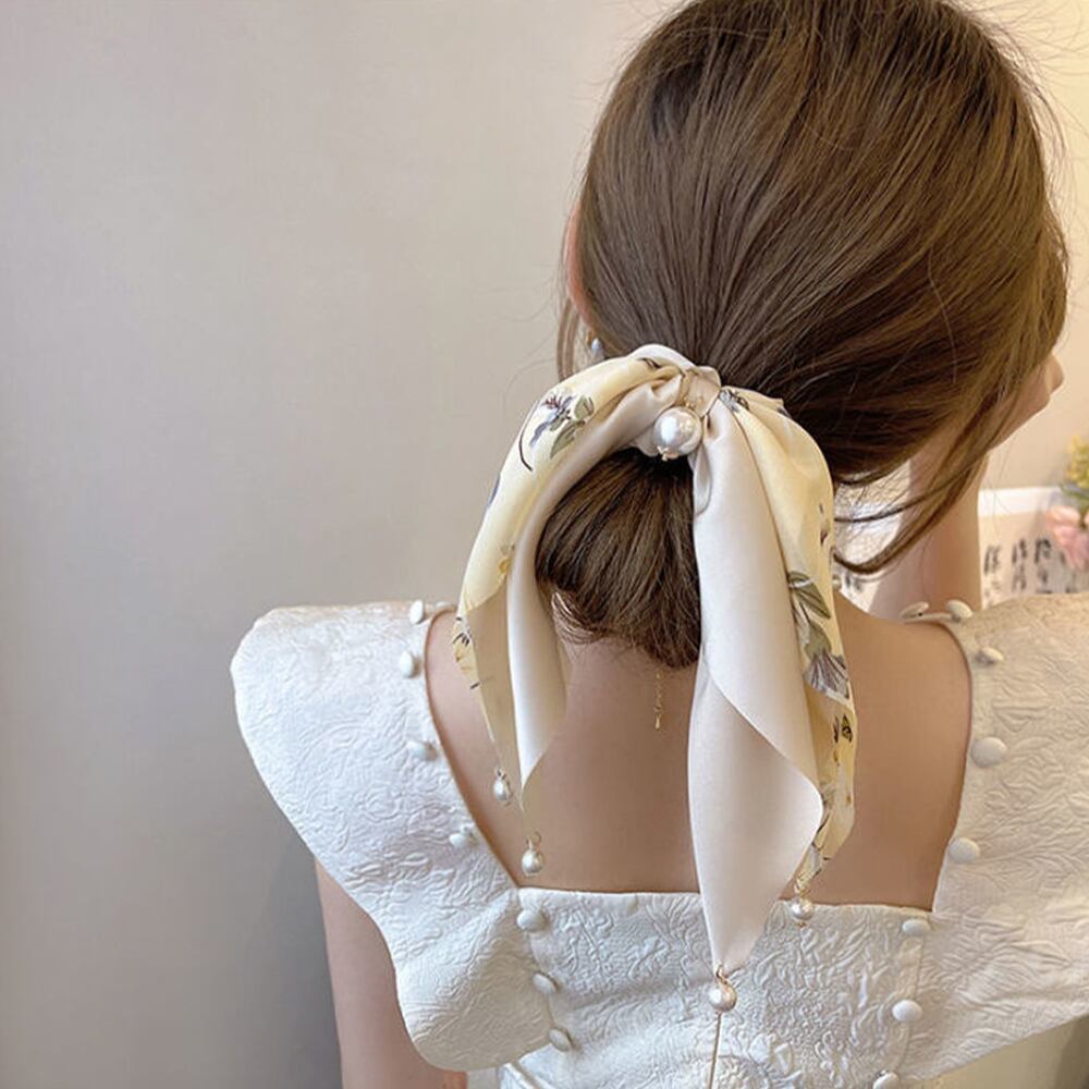 ゴージャスな印象を与える花柄スカーフシュシュです