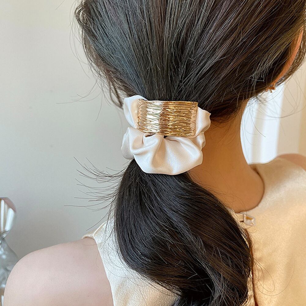シンプルながらもきちんと感や上品な雰囲気を演出するゴールドプレート付きヘアゴム
