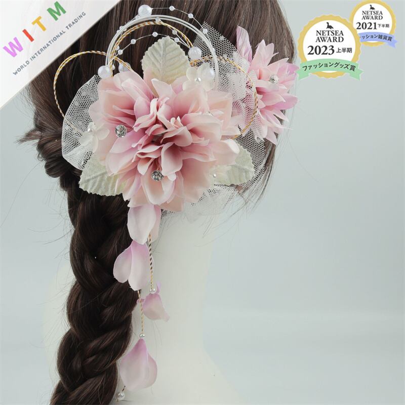 簪(かんざし)を挿して、もう一つをサブ髪飾りとして添えるとより華やかになります。